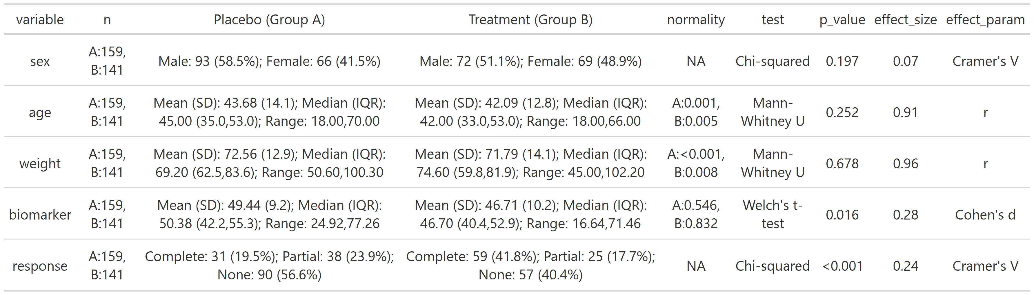 summary_table(clinical_df, group_by = 'treatment', exclude = c('participant_id', 'visit'))